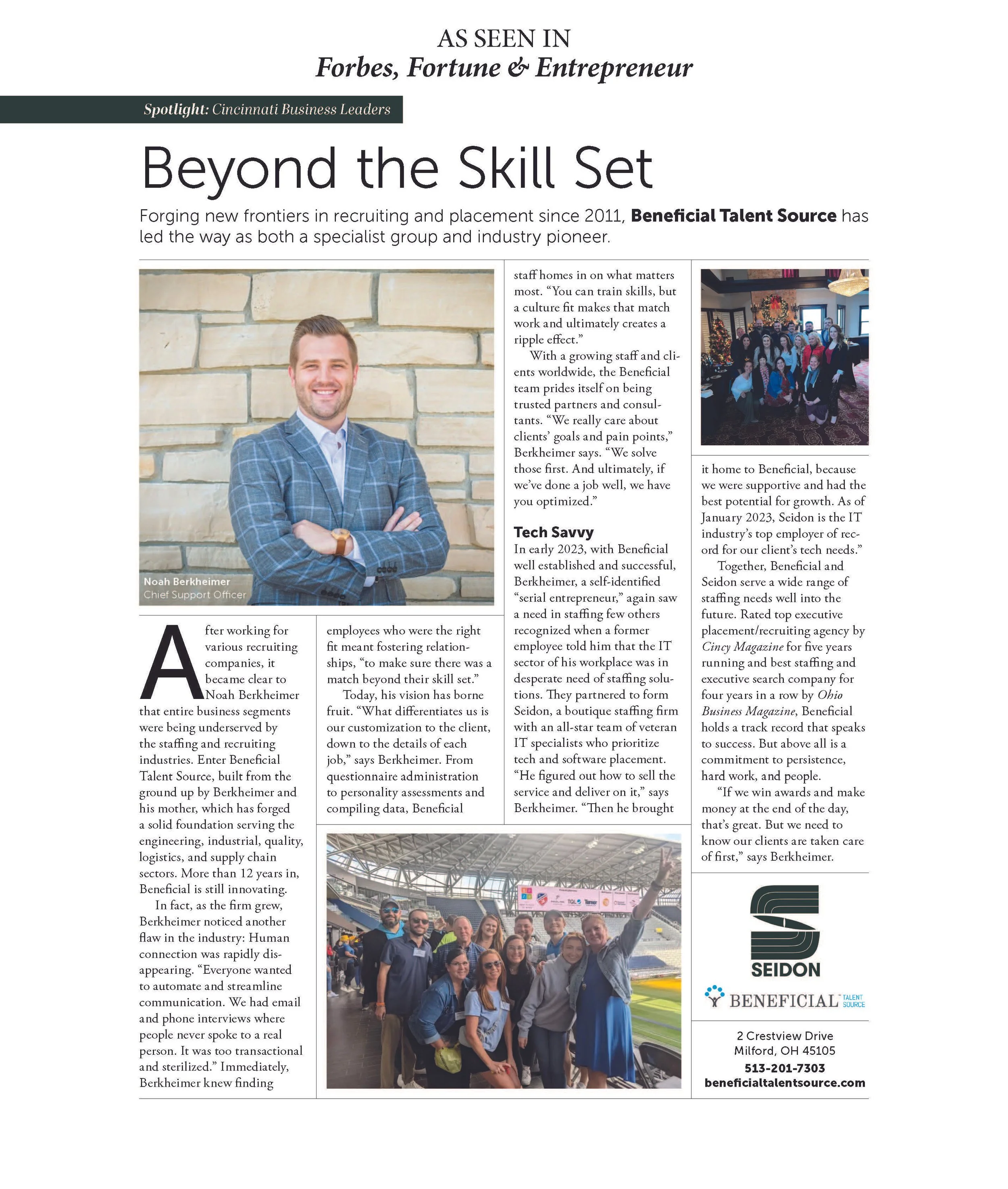 Forbes caught up with our sister company Beneficial Talent Source recently to ask about Beneficial and Seidon. Keep an eye out for the article: "Beyond the Skill Set: Forging new frontiers in recruiting and placement since 2011." in the southwest Ohio print editions of Forbes, Entrepreneur, and Fortune.